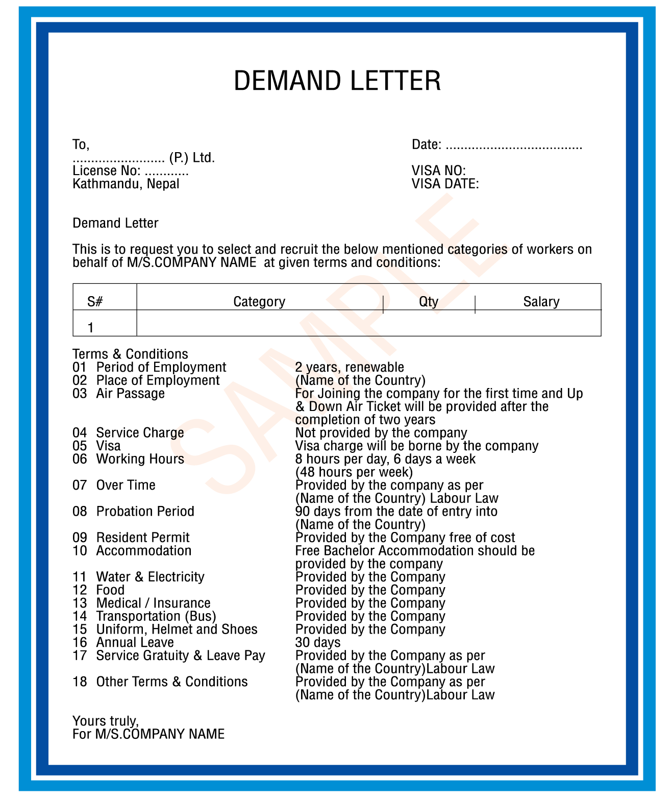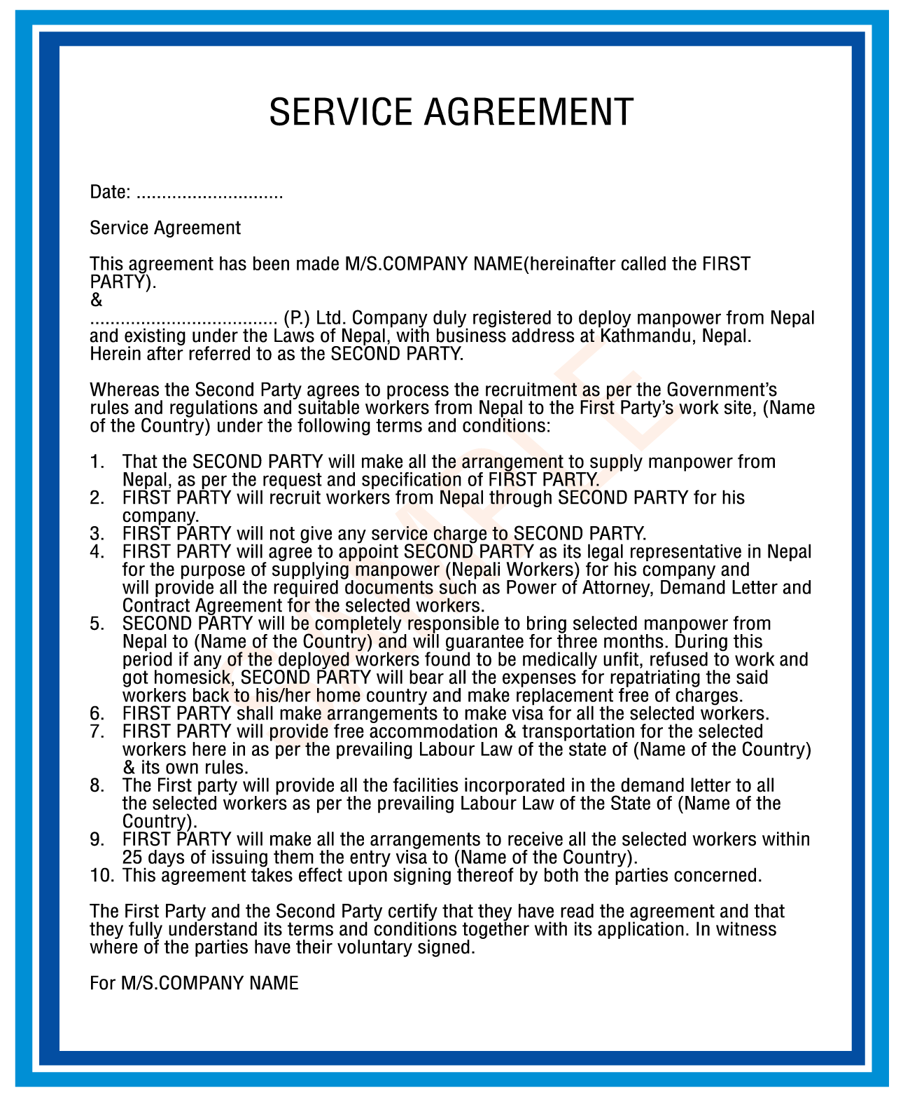 Employing Company should provide us service agreement between company and recruitment agency in Nepal.
